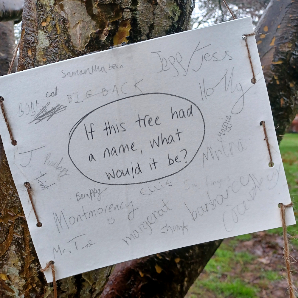 Placed on the ‘Climbing Tree’ at the very beginning of the month, I knew this would catch the eye of families on the way to school. But not only families … hidden in this list of names is such magic! Montemorency and Twist and Margaret. And ‘Six Fingers’ has made me look again and again at the tree, to notice its shape and form and yes, the six main limbs …